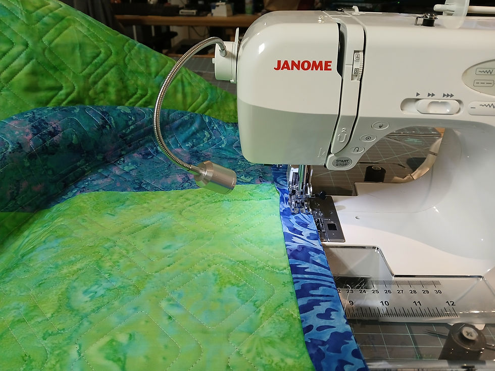We slept late on Sunday (2/8) but I finally made it to the studio and finished quilting on Linda’s quilt in the afternoon. While was happening, I worked on binding another quilt: